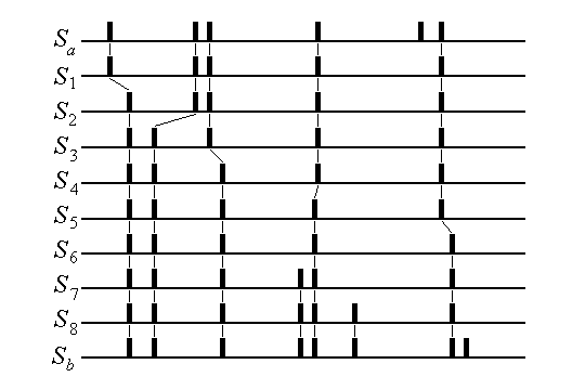 Hint: it is doubly recursive, and reduces the calculation of the distance between spike trains of length Na and Nb to consideration of spike trains of lengths Na-1 and Nb-1. Think about the constraints on the "world lines" of each spike in the above diagram for Dspike.